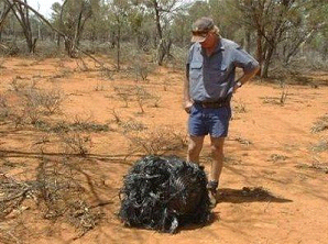 A képen egy ausztrál telektulajdonos kiváncsian szemléli a területére hullott űrszemetet. (Kép: http://uglyoverload.blogspot.com/2008_03_01_archive.html)