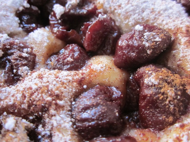 A tepsiben is hagyjuk egy kicsit kelni, közben előmelegítjük a sütőt 170 fokra. Sütés előtt rászórjuk a kimagozott, lecsöpögtetett meggyet, és kb. 25 perc alatt készre sütjük. Én akkor ki szoktam venni, és beszórom a fahéjas porcukorral, majd 5 percre visszateszem a sütőbe. Erre nincs feltétlenül szükség, de így a meggyek körül ráolvad a cukor, és finom karamelles íze lesz.