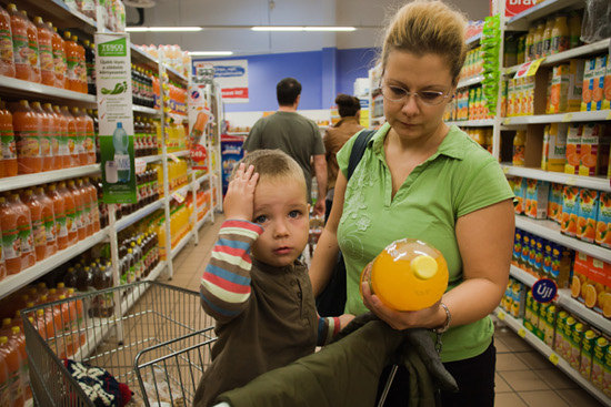 Gráf Katalin a hároméves Marcival nézegeti a kétliteres üdítőital összetevőit. – Hű, ebben legalább egy százalék gyümölcs van! Meg édesítőszer, amitől neked, kisfiam, menni szokott a hasad – teszi vissza a polcra a palackot, amin felirat figyelmeztet: „A gyermekek tevékenységére és figyelmére káros hatást gyakorolhat”. – Döbbenet, hogy ilyesmi kereskedelmi forgalomba kerülhet – mondja felháborodva az édesanya.
