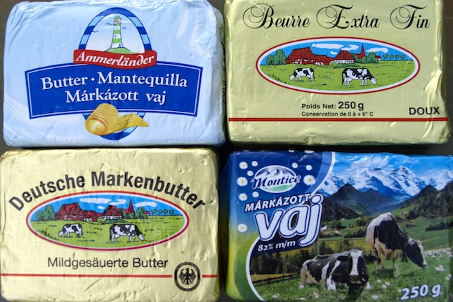 Deutsche Markenbutter (1556 Ft/kg - Auchan). Ezt a vajat is gyorsan elmentettük a "csak engedéllyel nyúlhatsz hozzá" vajasdobozba. Édes, zsírosan tejszínes, pikáns szalámik alá való. Hiányzik belőle az olaszok brutalitása, ez az édes stílus. Beurre extra fin (1796 Ft/kg - Tesco). Finom és édes, nemcsak csomagolásában hasonlít az előző tételre, hanem lényegében ugyanaz a vaj, más csomagolásban. Ammerländer (1719 Ft/kg - Interspar). Az előzőekhez hasonló, de sokkal lágyabb, visszafogottabb ízek. Montice (1796 Ft/kg - Interspar) - a Kerrygoldhoz hasonló, édes vaj, étolajos mellékízzel.
