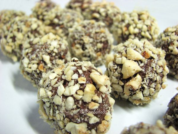 Egyesével meghempergetjük a golyókat a félretett mogyoróban. Az így elkészült golyókat 1 órára hűtőbe tesszük, hogy megkeményedjenek. Bár már így is fogyasztható. A tejcsokoládét vízgőz fölött megolvasztjuk és egy mártóvilla segítségével megmártogatjuk a gombócokat. A recept készítője eleve temperált csokoládét használt, így nem tett hozzá olajat. Egy rácsra téve hagyjuk lecsöpögni majd tegyük hűtőbe, hogy megdermedjen a csokoládé. Miután megdermedt a csokoládé, csomagolható vagy fogyasztható.