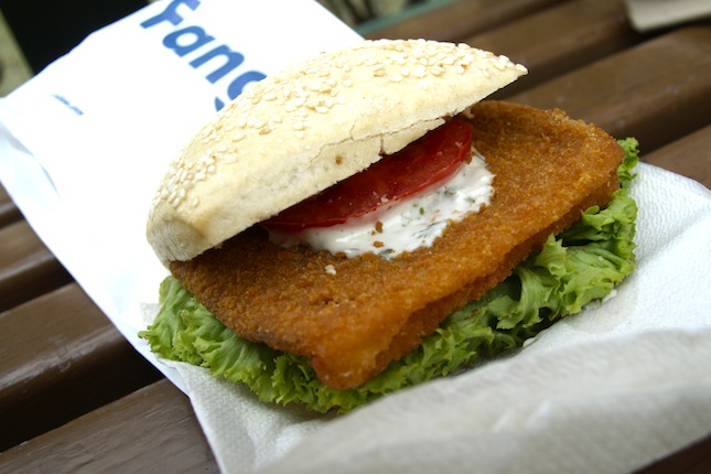 Ilyen volt: A halat az íze és vaskos lemezekre bontható szerkezete miatt tőkehalnak tippeltük, ugyanis jellemzően halízű, mármint jó értelemben. Nem olyan karakteres, mint a Nordsee-szendvics halszelete, de így is van jellege. Ebben is - ahogy mindháromban - túl édes remoulade-szerűség van, de szerencsére hiányzik belőle a Nordsee paradicsomos tévedése.