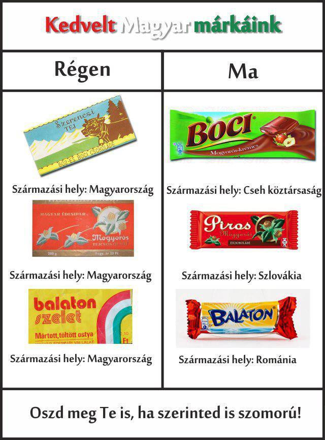 A régebben még Magyarországon készülő, ma is magyarnak hitt csokoládék nagy része már nem Magyarországon készül – most épp a Facebookon kering egy erről szóló kép. A terjesztői Bocit, a Piros Mogyoróst és a Balaton szeletet hozzák fel példaként a fogyókúrás szerek reklámjaiban közkedvelt ilyen volt, ilyen lett párbaállítással.