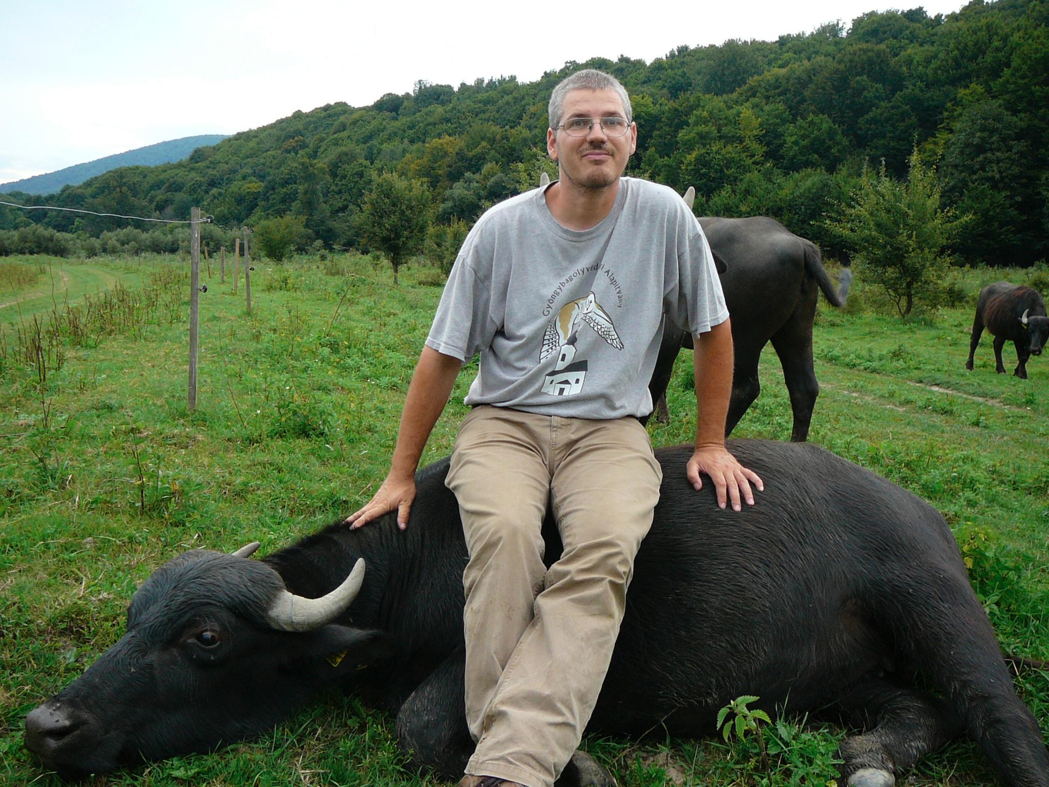 Darab idő után már a lába előtt hever a tekintélyes méretű állat, s valósággal mosolyog, amikor vakargatja a tőgyét – ez a legérzékenyebb pontja, a rovarok is itt támadják, ezért esik neki jól a vakargatás. A bivalyokat is fejni fogja Tibor, ami nem kis mutatvány, kevesen vállalkoznak rá. No de hát kevés dolog van, amire ne vállalkozna kedves állatai kedvéért. Sok ezer kilométert utazik, ha feltalál valami elveszettnek hitt, régi fajtát. Miközben kedvenc, több száz éves bükkfájától kanyarodunk vissza a házhoz, elmondja, hogy tapasztalata szerint lehet gazdálkodni a természetvédelmi érdekek szem előtt tartásával. Visszaérünk a portára, ahol népes kutyatársaság üdvözli a gazdát. S persze mi más, mint ősi magyar fajta: komondor, magyar vizsla, bukovinai pásztorkutya. Utóbbival kapcsolatban felmerül a kérdés, mennyire is magyar fajta, amire a gazda azt válaszolja: „annyira, amennyire mi, magyarok őshonosak vagyunk a Kárpátokban”. A búcsúkép is idilli, ahogy az ég alján, a sötétkék felhősávból előbukkanó nap fényében (megmenekül hát a széna!) játszik vendéglátónk a kutyákkal.