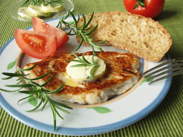 Tálaláskor a fűszervajat szeleteld fel, és tegyél egy-egy karikát a kisült húsra.