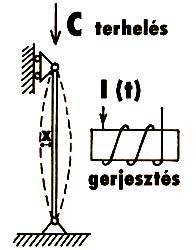 1. ábra. Felülről nyomott, rugalmas szalag, melyet egy elektromágnessel periodikusan mozgatunk. A mozgás időbeli lefolyását (egy adott geometria és lenyomó erő mellett) a levegősúrlódás és a gerjesztő erő amplitúdója befolyásolja.