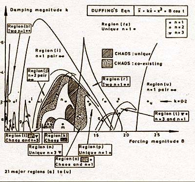 A 2. ábrán látható "térképen" az látszik, hogy 21 különböző viselkedésű régió alakul ki, ha csak a lemezcsillapítást és a gerjesztő erőt változtatjuk.