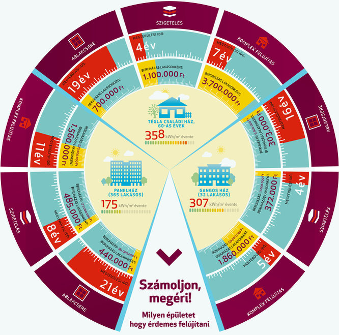 Ezen az infografikán azt mutatjuk be, hogy különböző épülettípusok esetén milyen beruházásba érdemes belefogni. A lila kör azt mutatja, hogy milyen beruházásról van szó, a középső kör jelzi a megtérülés időtartamát, a belső pedig 2012-es átlagárakon a költségeket: