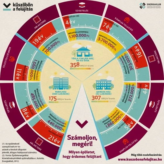A tipizálások alapján készült infografika 2012-ben azt mutatta, hogy egy, a ’60-as években épült családi ház komplex felújítása (ablakcsere + szigetelés) 3,7 millió forintba került, és 7 év alatt térülhet meg. A gangos házban ez lakásonként 1,86 millió + 5 év alatt megtérülés, a panellakás pedig 1,56 millióval + 11 év. Mindez persze közvetlenül a kormány rezsiharcának meghirdetése előtt. Most a megtérülési idők Király Zsuzsanna szerint 12-18 hónappal hosszabbodhattak, de szerinte még mindig nem jelent drasztikus változást, hiszen az ilyen beruházások 20-25 évig hatással lehetnek a lakókra.