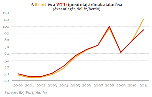 2011-ben folytatódott az olaj árának szárnyalása, illetve tovább tágult a a Brent és a WTI közötti árkülönbözet is. Az olaj árát az év első felében az Arab tavasszal kapcsolatos aggodalmak hajtották fel, majd a líbiai helyzet csitulásával az év vége felé az Irán nukleáris politikájához kötődő kockázatok tartották magasan a fekete arany árát. A BP kalkuláció szerint a Brent éves spot-átlagára meghaladta a hordónkénti 111 dollárt, míg az amerikai piacra jellemző WTI-vel éves átlagban 95 dolláros szinten kereskedtek.