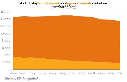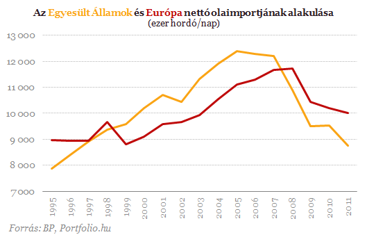 Az Egyesült Államokban a relatíve alacsony készletek ellenére továbbra is igen nagymennyiségű olajat hoznak a felszínre (2011-ben a globális termelés 8,8%-a valósult meg itt), és a kitermelési szint az elmúlt években folyamatosan emelkedett, így érdemben javult az ország nettó importőri pozíciója az elmúlt évek során. Európában is érdemben csökkent az olajbehozatal az elmúlt évek során, azonban ez elsősorban a gazdaság lassulásával összeköthető fogyasztáscsökkenésnek volt betudható, az uniós olajtermelés ugyanis folyamatos csökkenést mutat. Az EU olajimportja jelenleg több mint napi 1000 hordóval haladja meg az Egyesült Államokét.