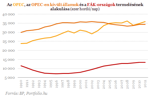 A OPEC tavaly a világon kitermelt kőolaj 42,4%-a felett gyakorolt kontrollt, míg a volt a szovjet térséghez köthető kihozatal a globális termelés 16,%-át adta. Az OPEC-en és a FÁK-államokon kívüli termelés így a tavalyi össztermelés 41%-át adta. Ez egyben azt jelenti, hogy 2011-ben az azt megelőző évhez képest az OPEC 3%-kal növelte a kitermelését, ami mellett a többi ország nagyságrendileg szinten tartott termelését.