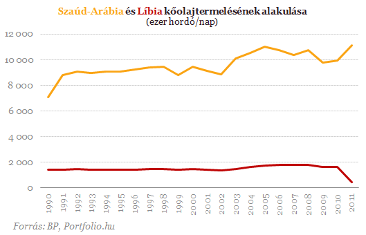 2011-ben még főleg a líbiai események tartották izgalomban az olajpiacokat (az "Arab tavasz" kiújulásától való félelmek továbbra is hatást gyakorolnak a piacokra, de 2012-ben már alapvetően az Iránnal kapcsolatos hírek befolyásolják az olajpiacot), a polgárháborúba sodródott országban jelentős kiesés következett be a kitermelésben, amely mennyiségeket a kereslet-kínálati egyensúly fenntartása érdekében elsősorban Szaúd-Arábia igyekezett pótolni. Líbiában 2011-ben éves összehasonlításban 71%-kal csökkent a kitermelés, ami napi 1,2 millió hordós kiesést jelentetett. Szaúd-Arábia ezzel szemben tavaly 12,7%-kal emelte kihozatalát, a BP adatai alapján így a királyság napi 11 161 hordónyi olajat hozott a felszínre. Arányaiban szintén jelentős, 10% feletti termelésnövelés valósult meg Irakban és az Egyesült Arab Emirátusokban is tavaly.
