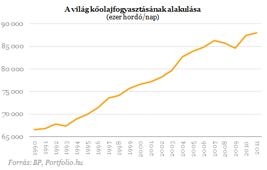 A BP nemrég megjelentetett globális energiapiacot átfogó éves statisztikája szerint az elmúlt évben ismét rekordot döntött a világ kőolajfogyasztása. 2010-hez képes ugyan arányaiban nem volt magas a fogyasztásbővülés, de a 0,7%-os emelkedés így is közel napi 600 ezer hordós többletet jelentetett. 2011-ben a világon napi 88 millió hordót olajat fogyasztottak.