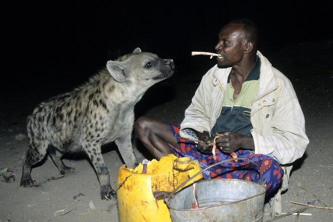 Kép: Egy férfi hiénát etet Etiópiában, Forrás: AFP/Photononstop/Yvan Travert