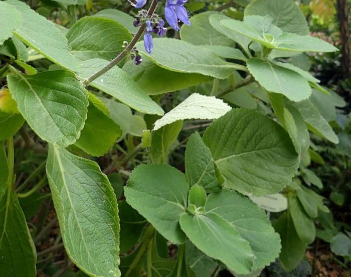 A Plectranthus barbatus egy lombos növény, amely akár 2 méter (6,6 láb) magasra is megnőhet. Levelei nagyjából egy ipari WC-papír négyzet méretével egyeznek meg, és menta-citrom illatot árasztanak.